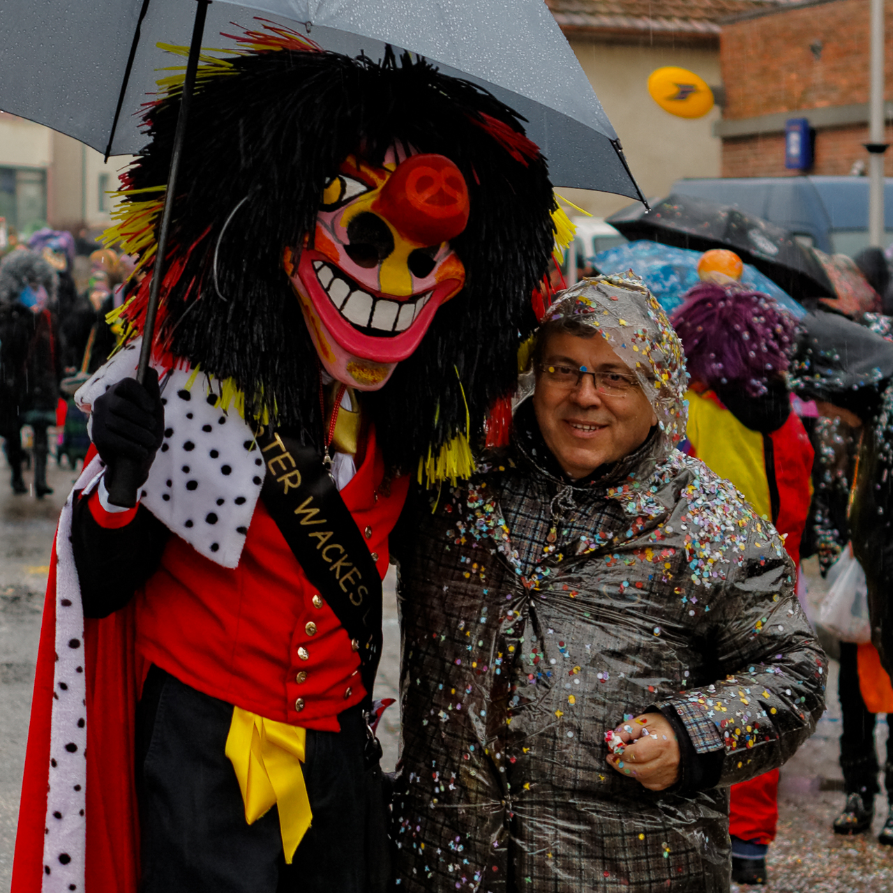 La joie, la bonne humeur, les couleurs du grand cortège, composé de chars et nombreux amis wackes, waggis, guggamusik de la région, rayonnaient dans les rues du village. Il avait fière allure Mister Wackes d’Alsace, parapluie de la main gauche, bonbons de la main droite.