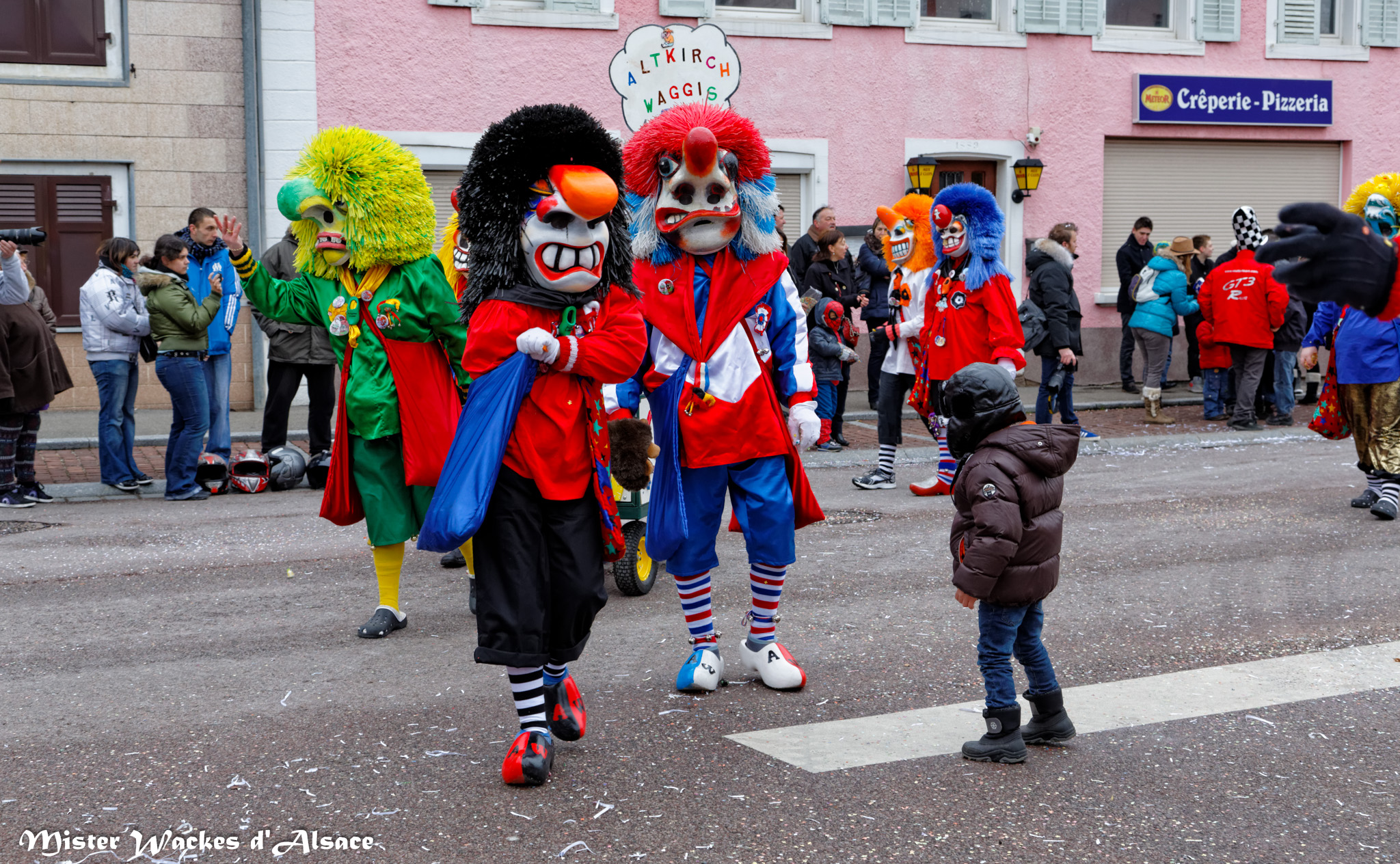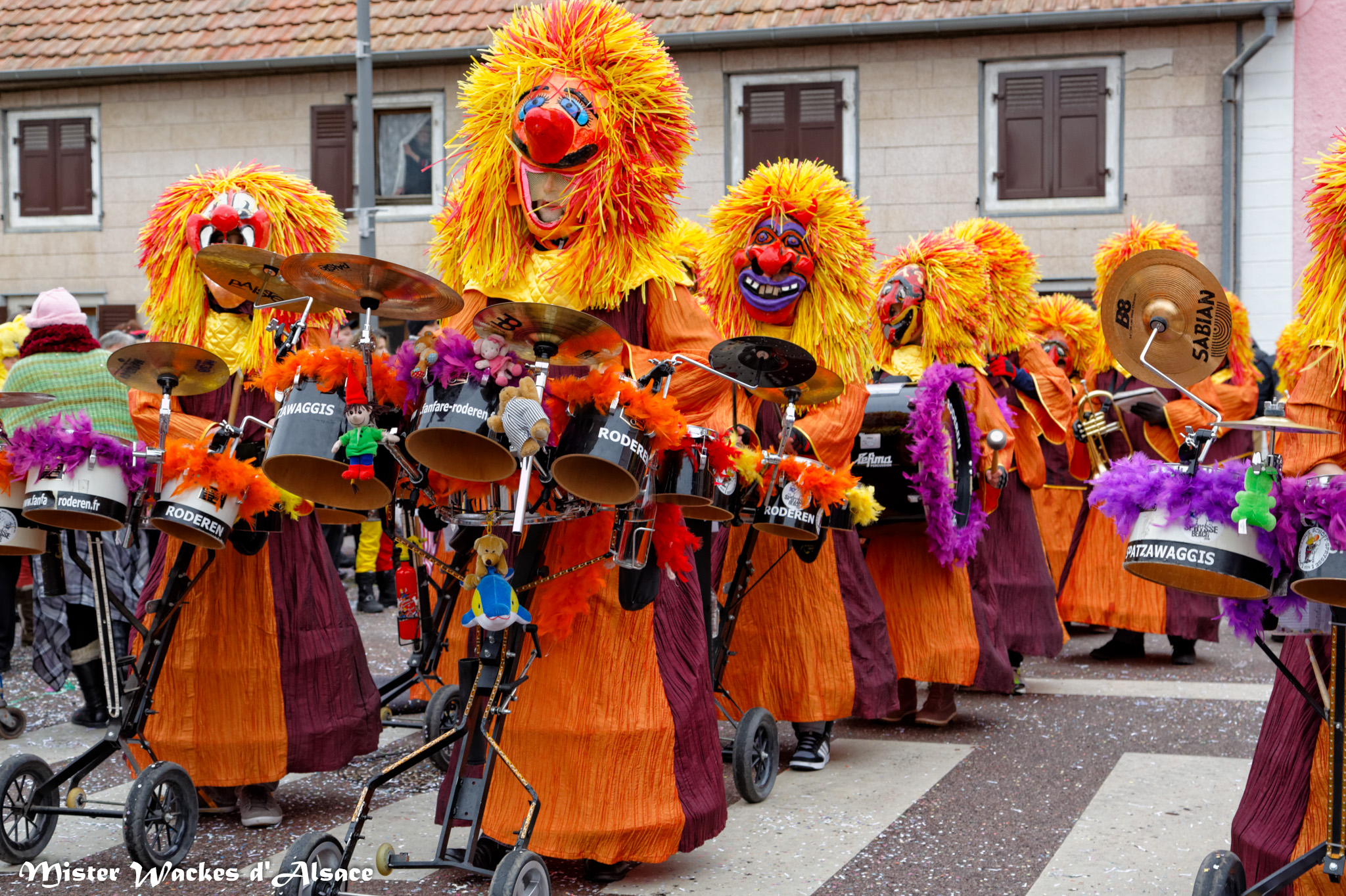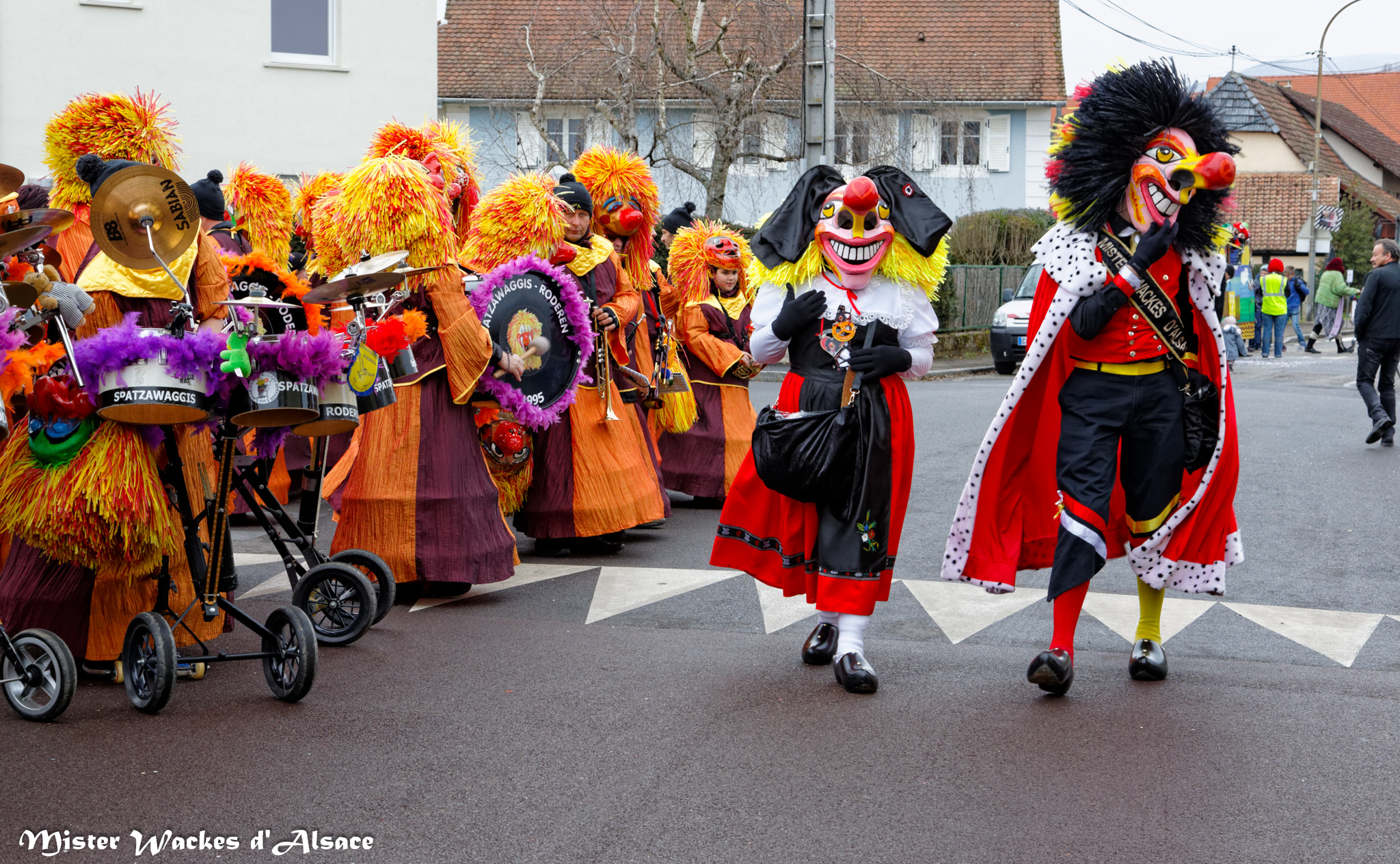 De prestigieuses troupes et cliques de la région ont accompagné cette belle cavalcade carnavalesque. On reconnaitra la Haxa Gugga de Rouffach, la Crapaudière de Eschentzwiller, les Altikirch Waggis … d’Altkirch, les Verructa Storcka de Cernay, les Spatzawaggis de Roderen et bien sûr notre Mister Wackes d’Alsace et sa dulcinée Elsa de Bollwiller.
