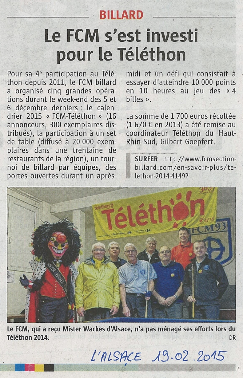 L’énergie déployée par le FCM Section Billard en faveur du Téléthon est considérable. A elle seule, cette association a récolté, l’an passé, grâce à ses actions, la coquette somme de 1670 euros, ou 10% des dons recueillis par l’AFM-Téléthon Mulhouse.