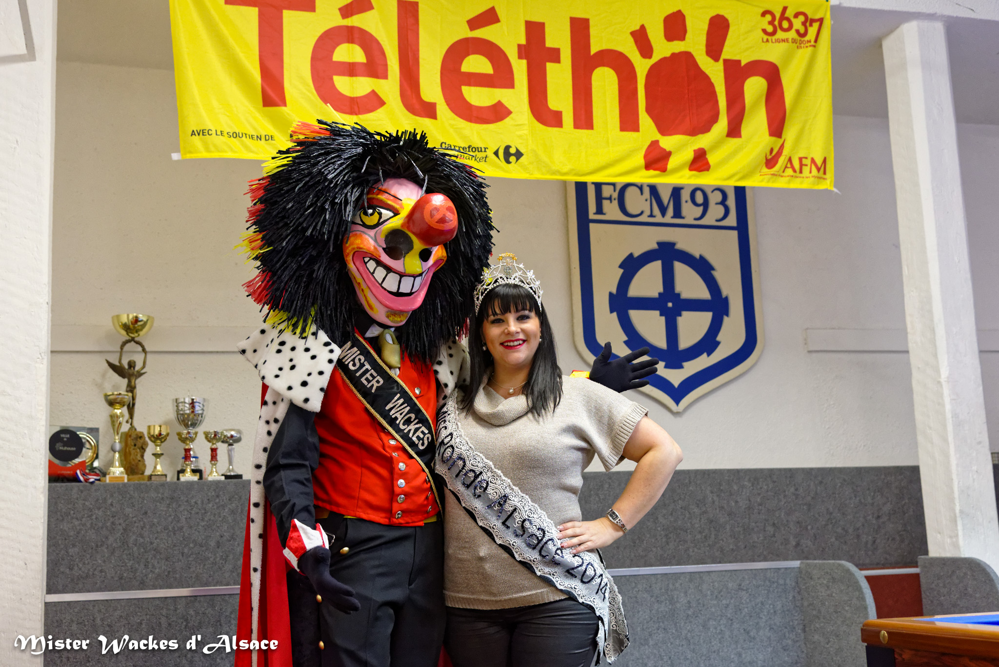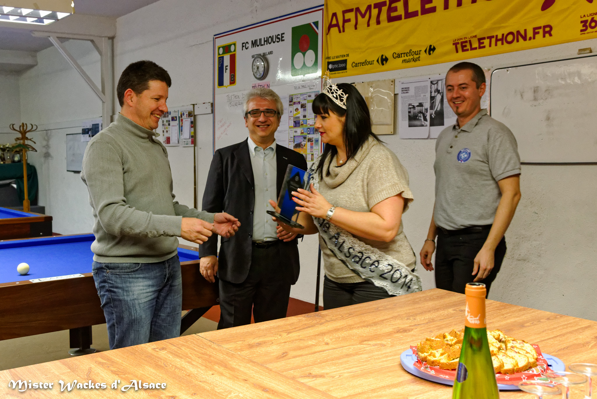 Les heureux vainqueurs du tournoi et du défi Téléthon se voient remettre leur trophée bien mérité par les invités d’honneur, Roland Chaprier, adjoint au Maire de Mulhouse délégation sport, Sophie Ageorges, Miss Ronde Alsace 2014 et notre adorable garnement, Mister Wackes d’Alsace.