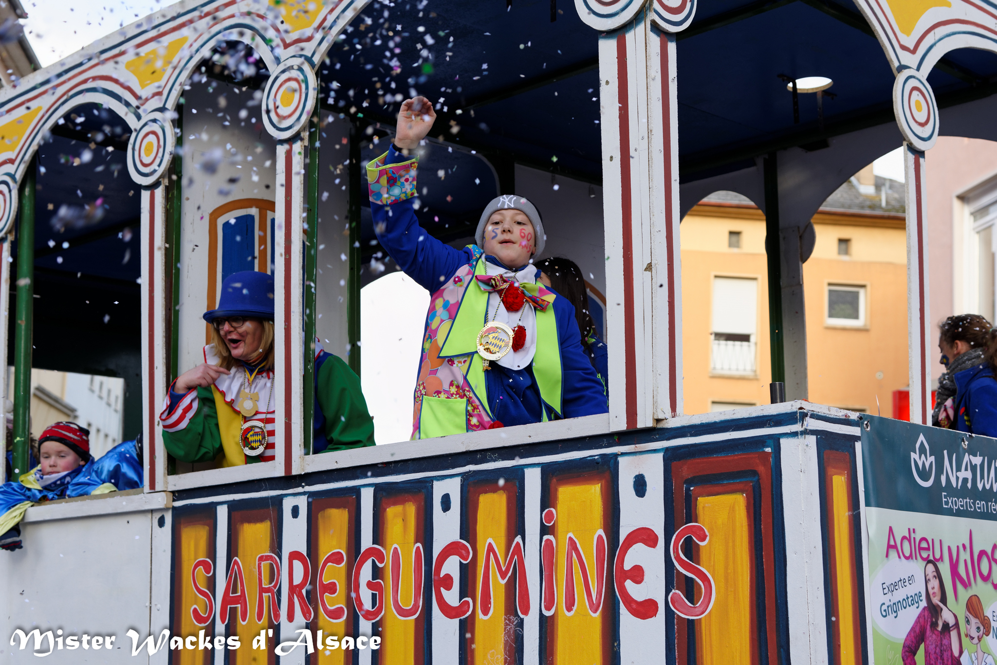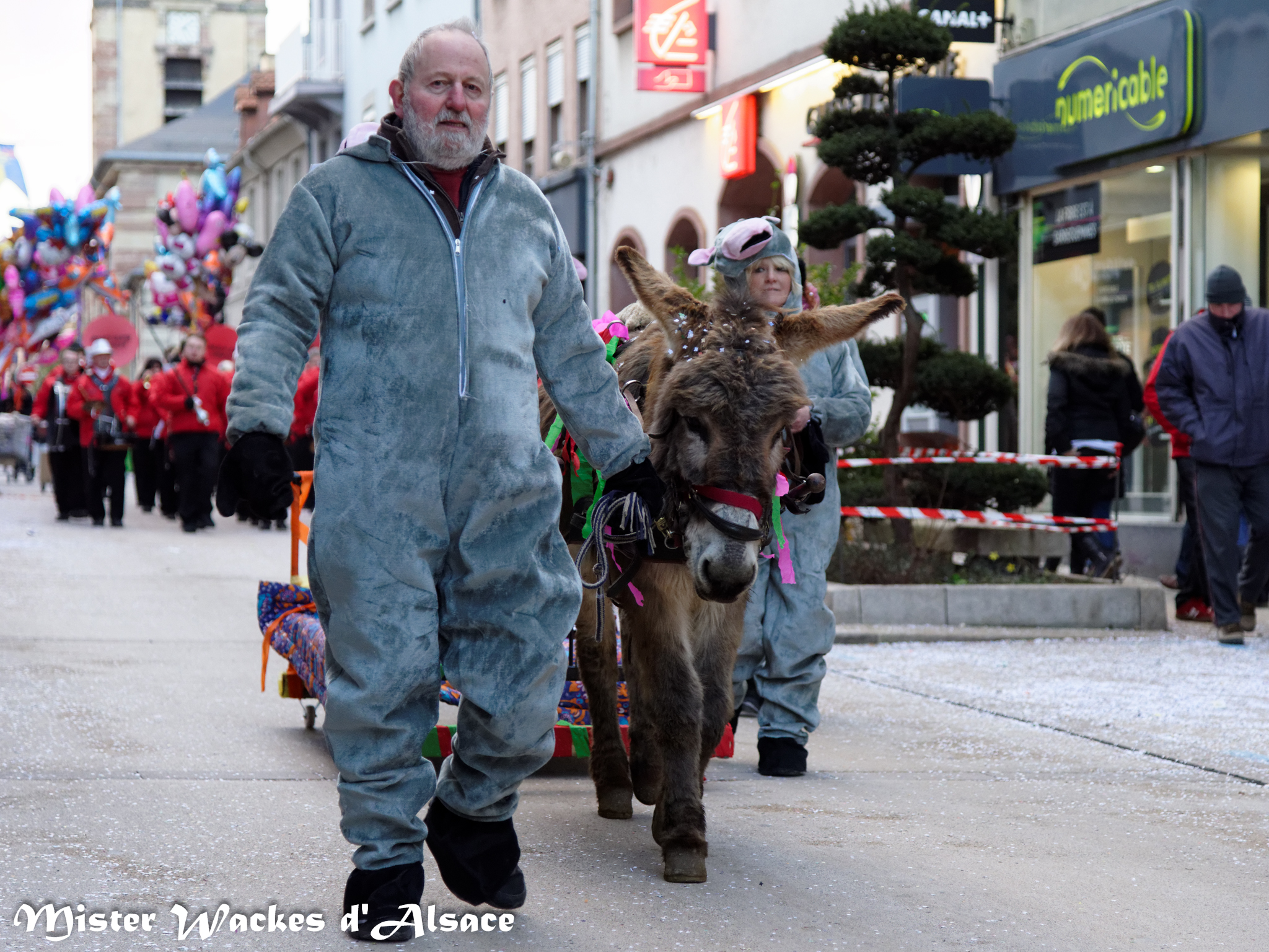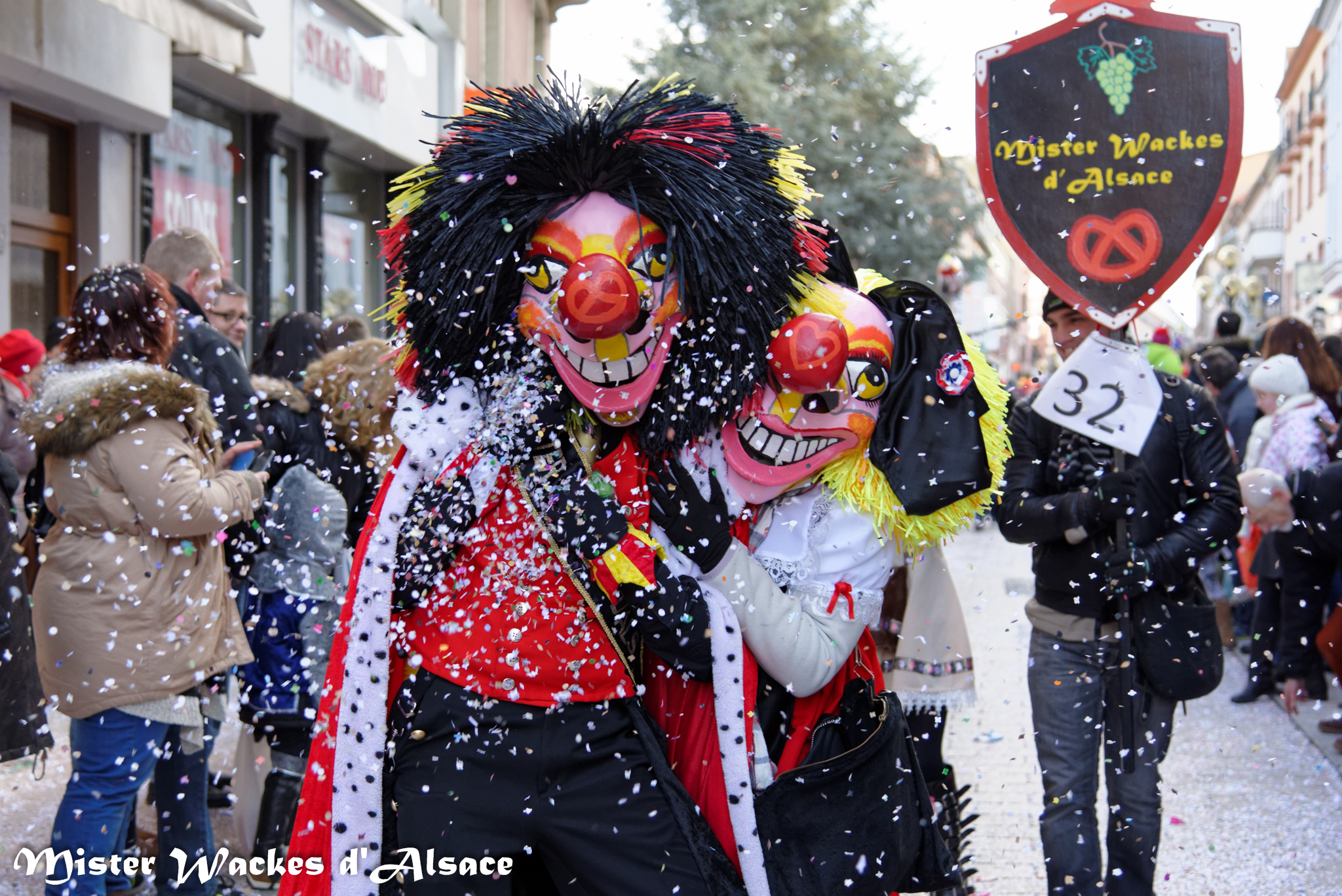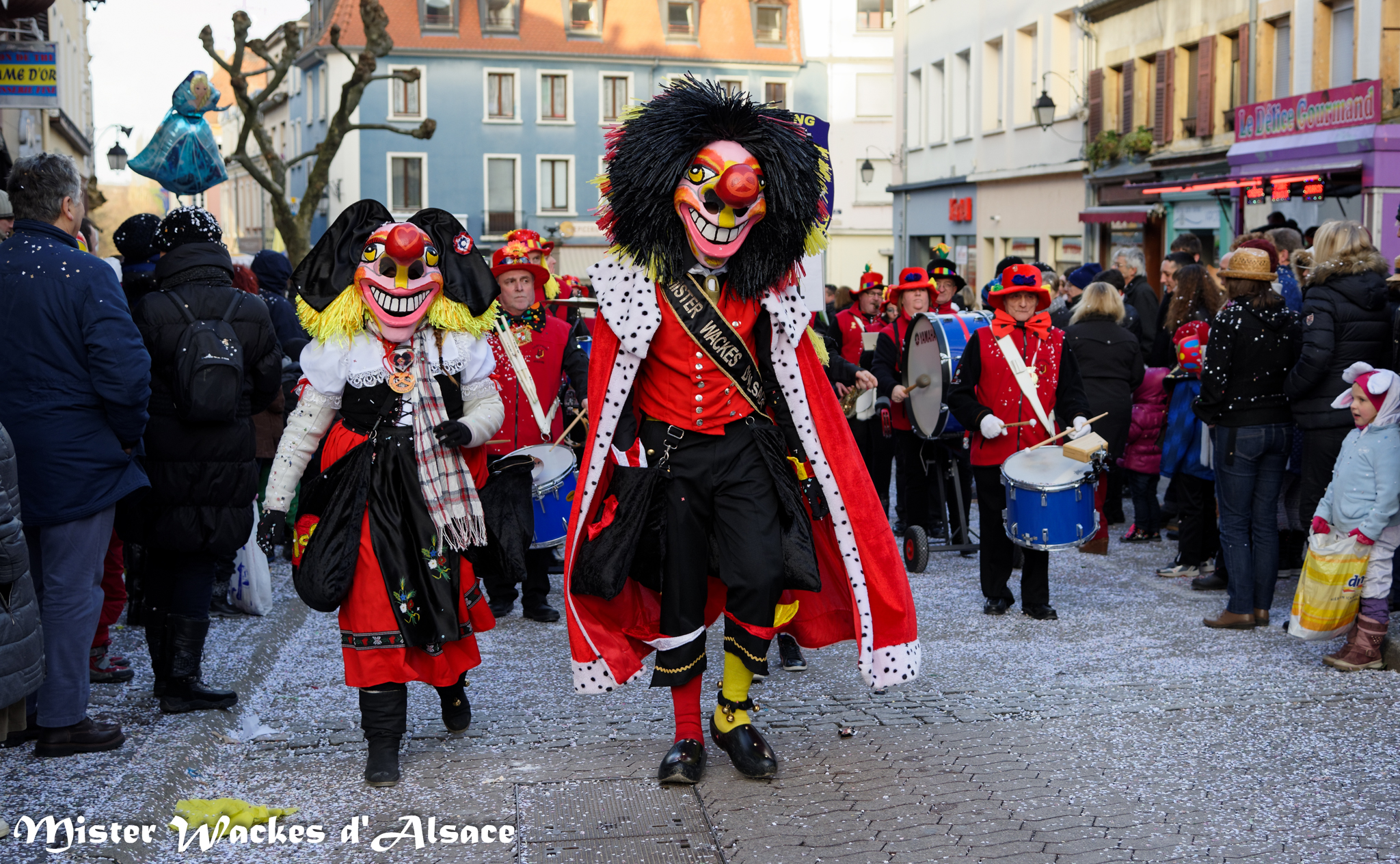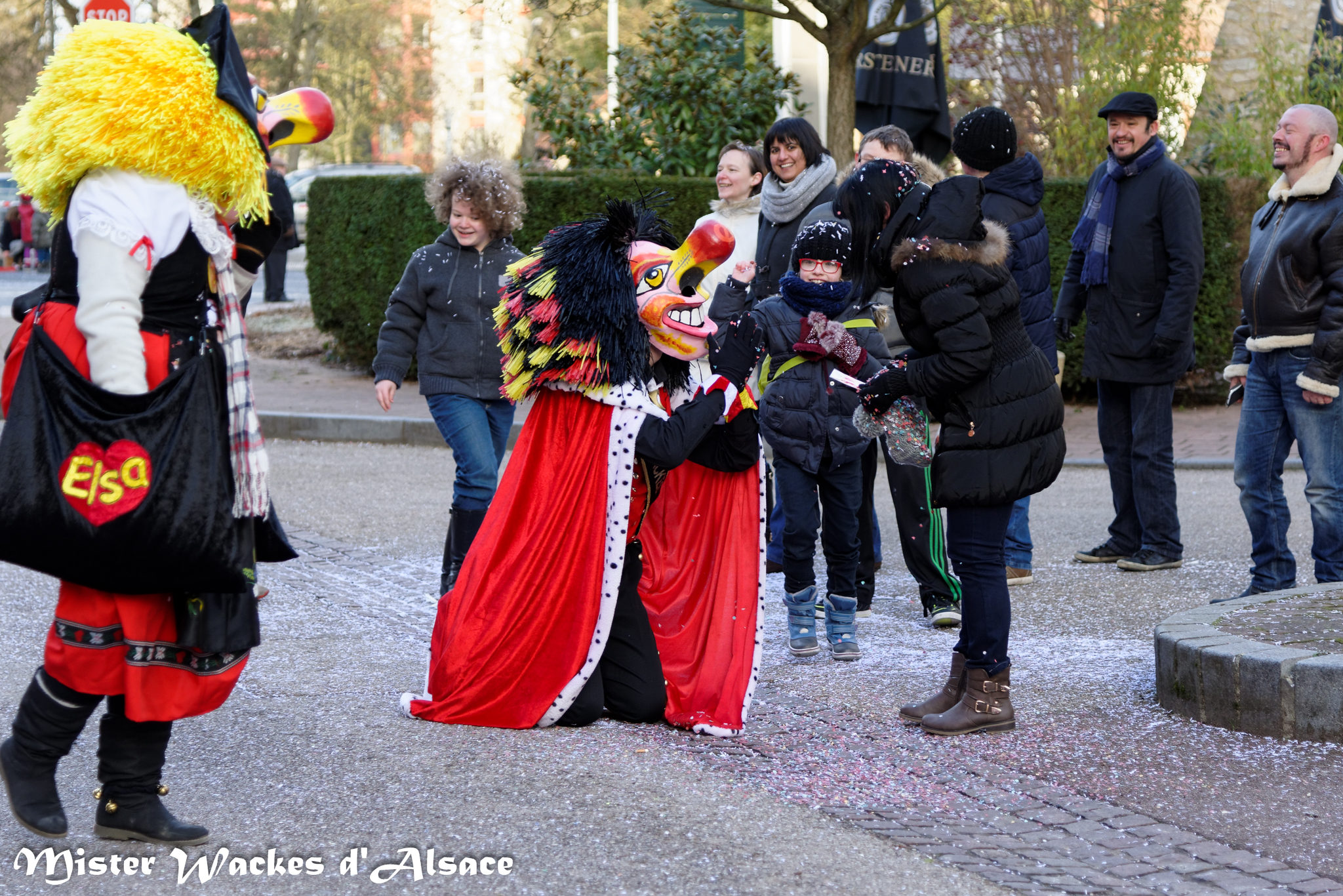 Mister Wackes d’Alsace est un habitué du Carnaval de Sarreguemines — il court après les jeunes filles, parfait la coiffure des mamies avec quelques confettis … d’ailleurs on peut se demander qui est le plus filou des deux, Mister Wackes d’Alsace ou sa dulcinée Elsa … mais très vite ils savent se faire pardonner en offrant bonbons et gadgets aux petits et grands.